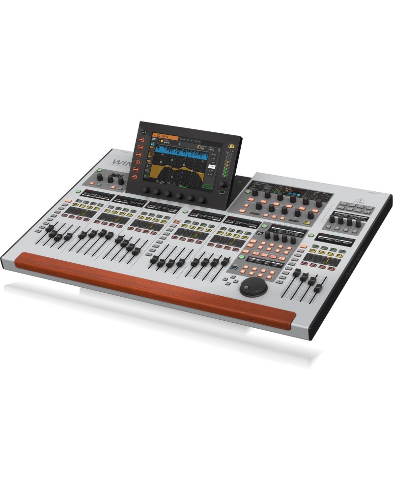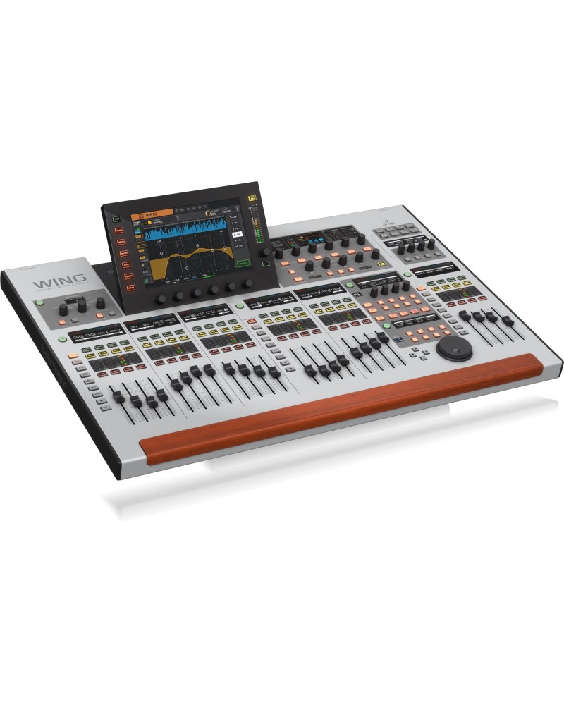 La superficie de control WING utiliza una gran interfaz de pantalla táctil capacitiva con controles giratorios sensibles al tacto para una nueva facilidad de operación. Tres secciones de fader separadas y una sección de controles personalizados se pueden adaptar de manera fácil e intuitiva para satisfacer sus requisitos personales. No importa si necesita un fader de envío de bus específico al lado del fader de canal correspondiente, o un canal de "dinero" dedicado siempre a su alcance, o incluso compartir la superficie con dos ingenieros: WING puede configurarse para elevar su producción a un nuevo nivel . Incluso puede reemplazar y personalizar el enorme reposabrazos de madera con algo más divertido si lo desea. El dibujo técnico se puede encontrar en la sección Descargas de la página del producto.