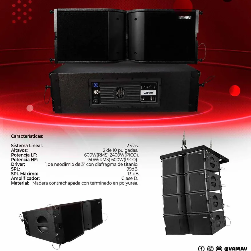 Line Array Activo con woofer de 12″ y 3 drivers de compresión de 1.35″ (neodimio). Potencia de 600W RMS, SPL máximo de 136 dB, entrada y salida XLR, conexión Powercon y opción de puenteo de corriente. Diseño compacto con montaje dual para poste o trípode. Ideal para eventos, DJ y estudios.