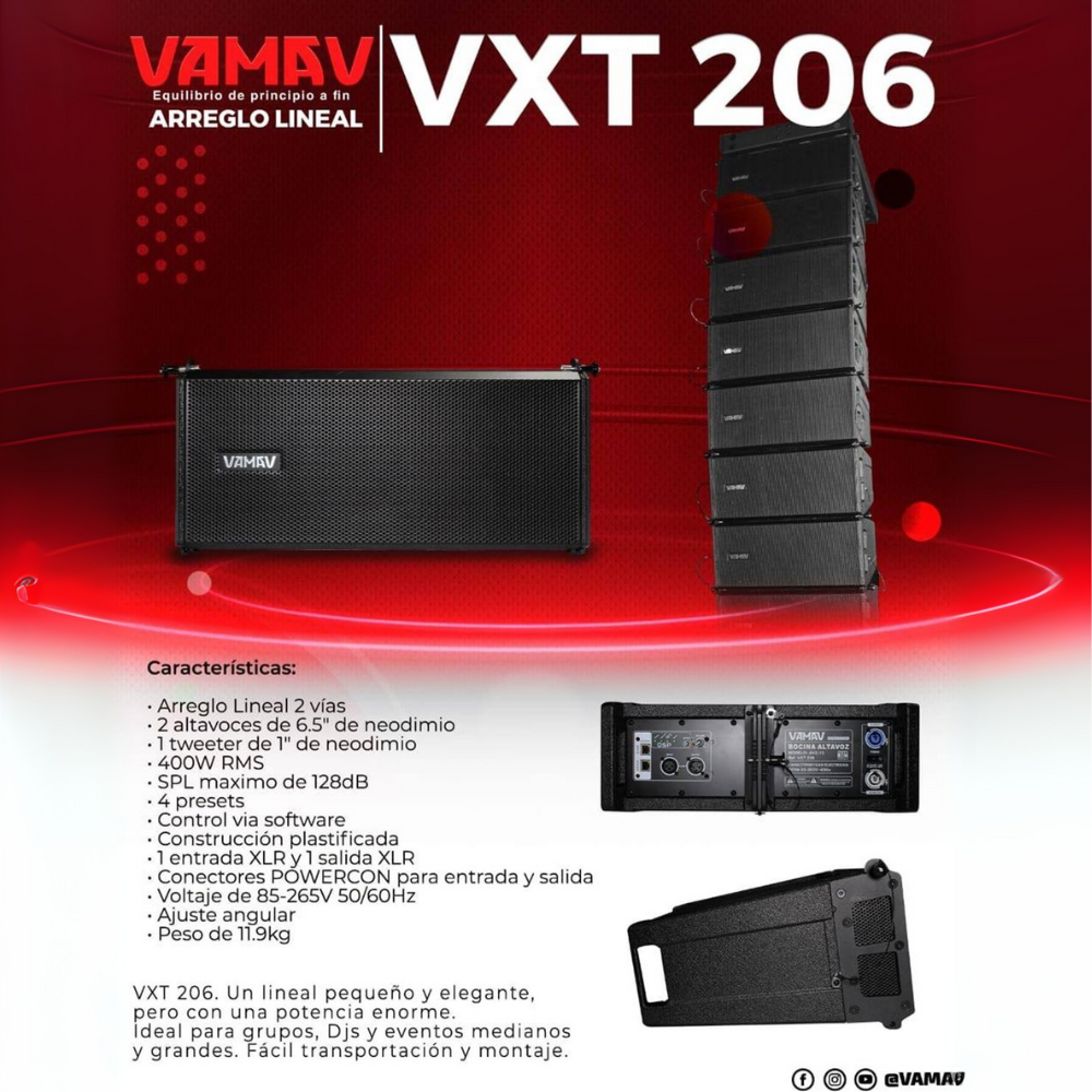El VAMAV VXT 206 es un sistema de Line Array compacto y elegante, diseñado para ofrecer un rendimiento sonoro excepcional en eventos de tamaño mediano y grande. Su diseño portátil y robusto lo hace ideal para grupos musicales, DJs, productoras de eventos y empresas de sonido profesional que buscan una solución potente y versátil.